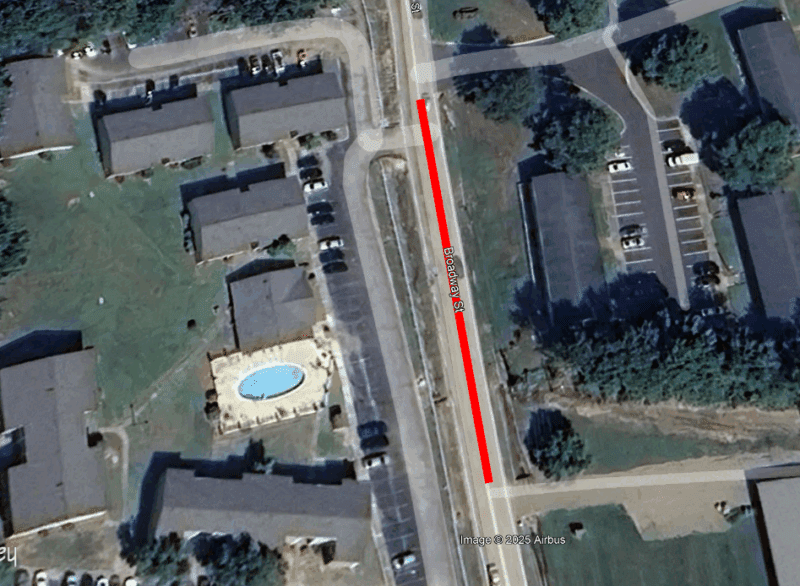 Beginning Monday, July 14, weather permitting, crews will begin a bank stabilization and drainage improvement project along Broadway Street in front of Landmark Apartments.